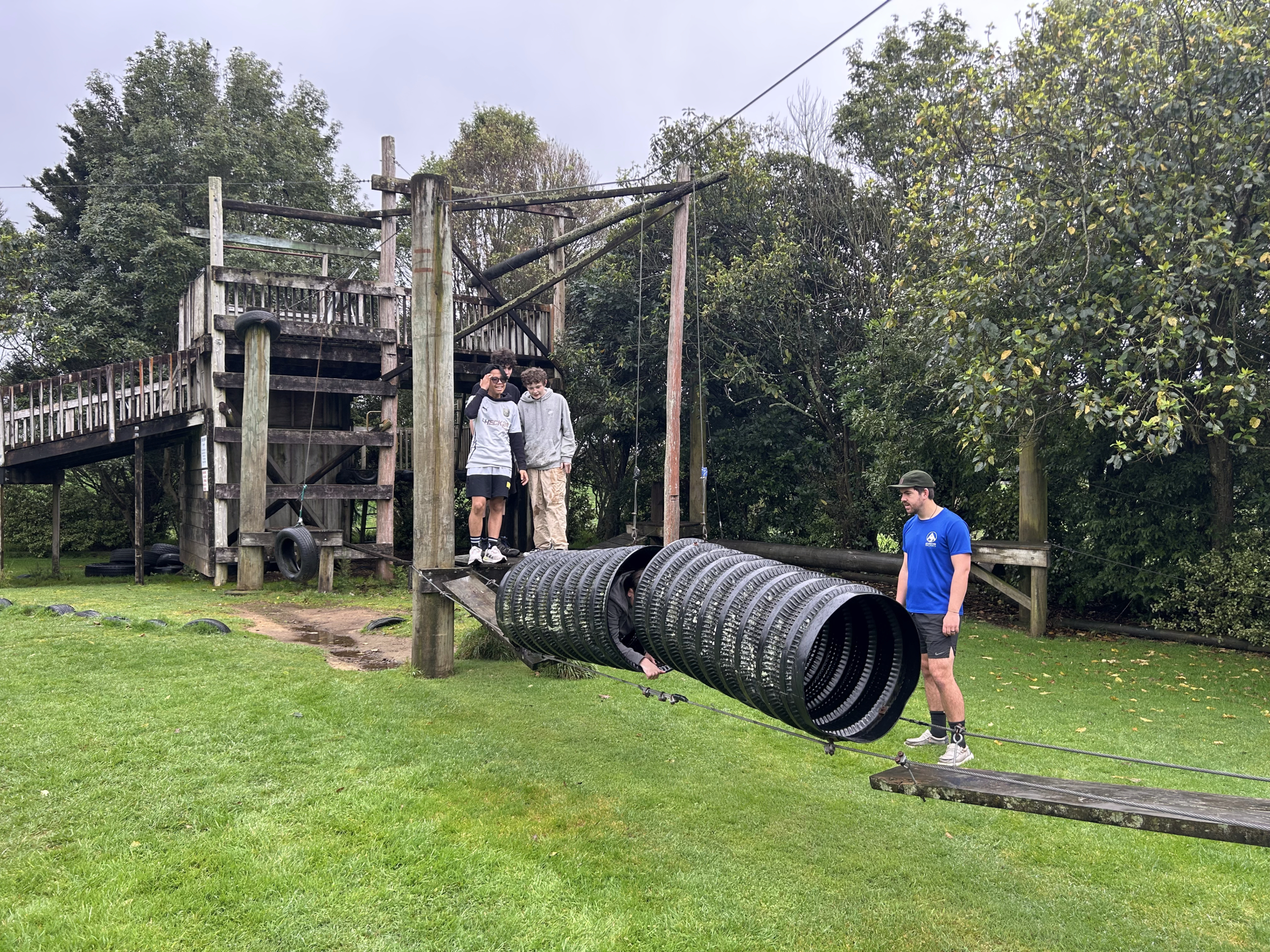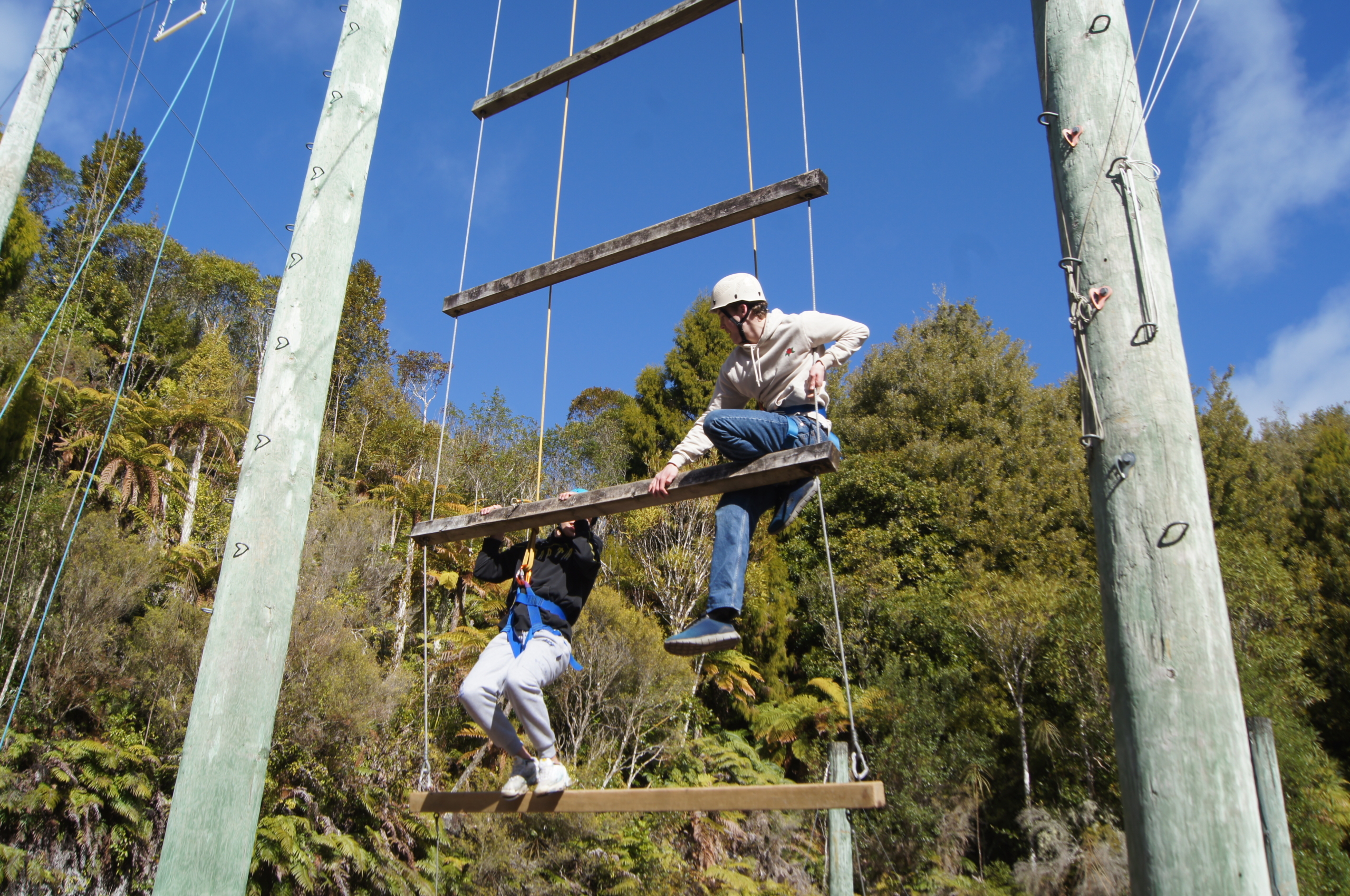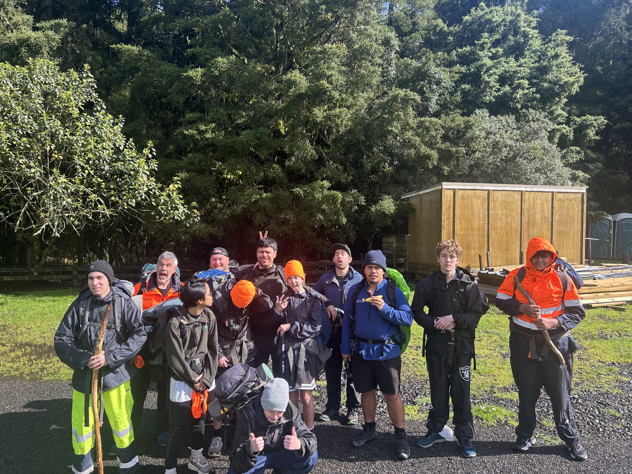 At Otanewainuku Scenic Reserve, near Tauranga, they hiked through native bush and learned bushcraft skills, including knot tying, fire building, and crafting backpacks from tarps, sticks, and rope.